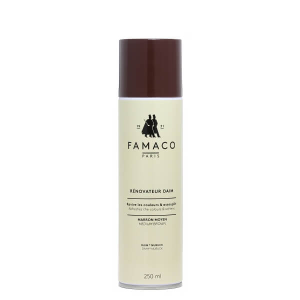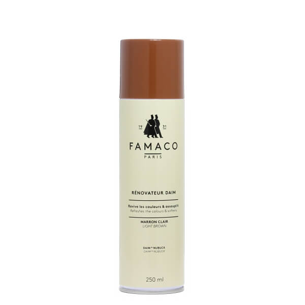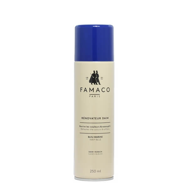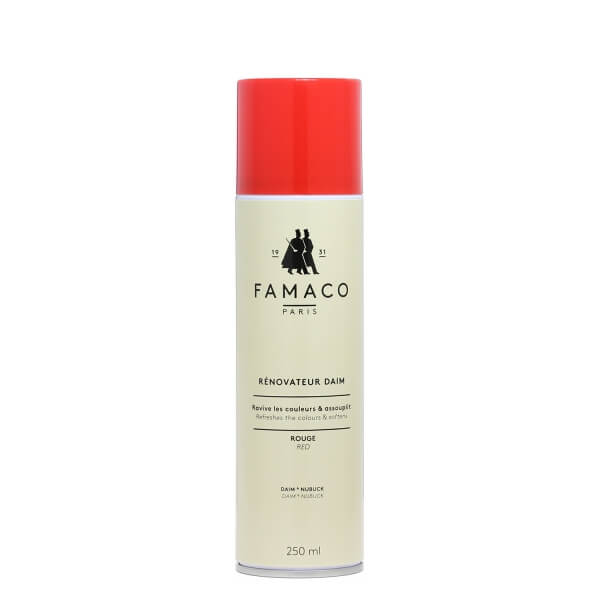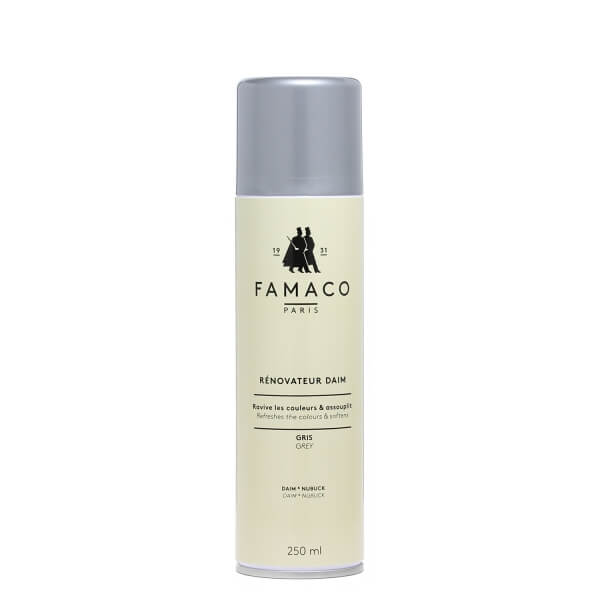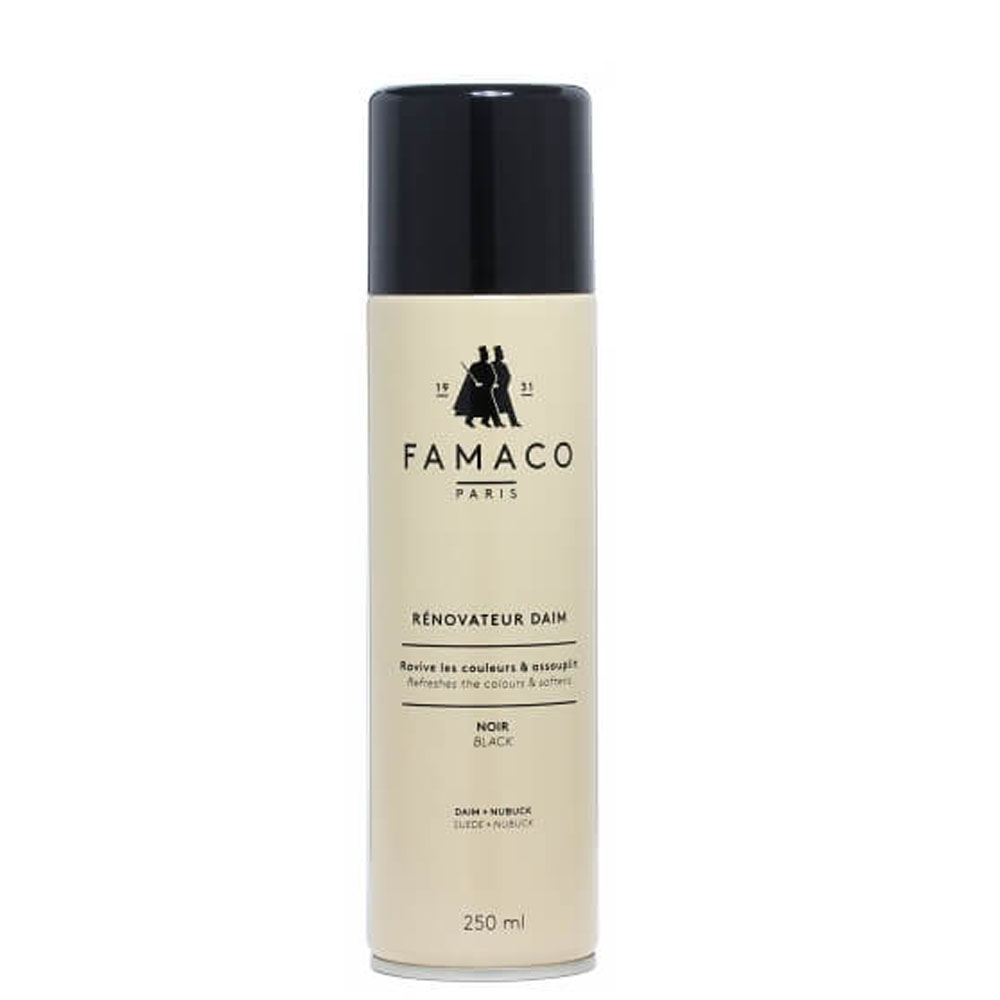 Восстановитель цвета для замши RENOVATEUR DAIM FAMACO 250 ML. предназначен специально для ухода за замшевой обувью, а также для ухода за обувью из нубука. RENOVATEUR DAIM FAMACO позволяет вам питать и защищать вашу замшевую обувь. RENOVATEUR DAIM FAMACO позволяет сохранять и восстанавливать цвет замши и нубука. Регулярное применении РЕНОВАТОР ДЕЙМ ФАМАКО интенсивно питает и предотвращает высыхание замшевой обуви и обуви из нубука. В дополнение к своим увлажняющим свойствам, он придает черной замше всю интенсивность ее цвета, эффективно перекраивая ее области которые потеряли цвет. Он также предотвращает образование жирных пятен и сохраняет влагу замши, чтобы поддерживать ее красивый внешний вид. Удобный аэрозольный баллон помогает вам легко использовать RENOVATEUR DAIM FAMACO и его объема достаточно для поддержания цвета ни одной пары замшевой обуви и обуви из нубука.